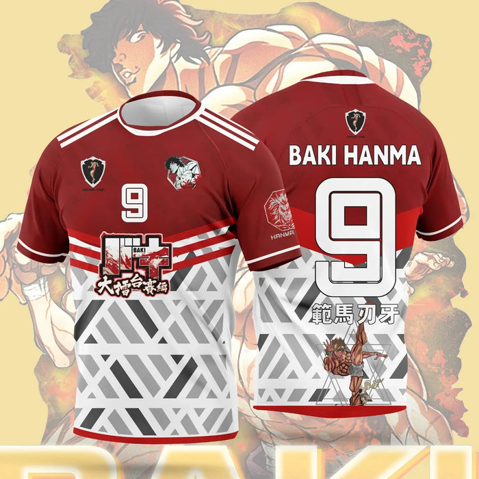 Inspiré du légendaire combattant Baki Hanma, ce maillot de foot rouge et blanc allie puissance et esthétisme. Avec son numéro 9 et son illustration dynamique dans le dos, il reflète l’énergie brute du héros du manga.